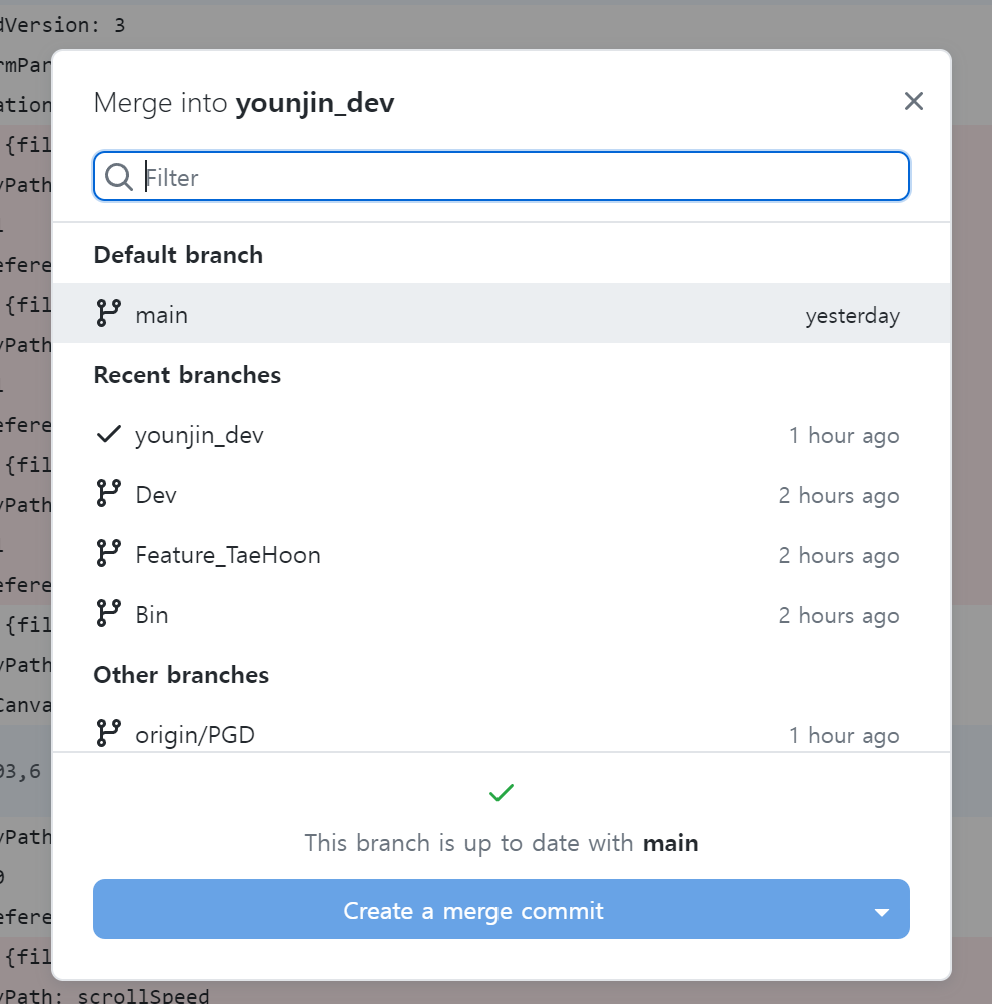 부모저장소(ex. main) 브렌치에서 > 파일을 가져올 자식브렌치 merge
