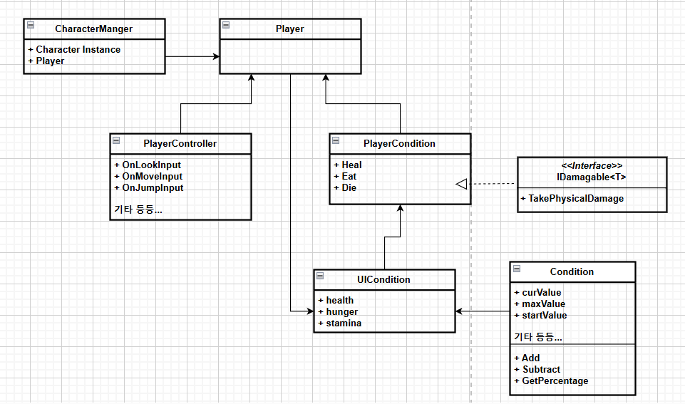 컨디션의 공통 속성과 공통 메서드를 정의한 컨디션 클래스를 생성한다. UI 클래스는 컨디션 클래스를 참조한 매개 변수를 선언해 사용한다. 즉, 해당 변수들은 컨디션 클래스에 있는 속성과 메서드를 가지고 있게 된다. 플레이어 컨디션 클래스는 이 UI 클래스를 참조해 컨디션 클래스에 있는 속성과 메서드를 호출해서 값을 조정하고 관리하는 역할을 한다.
