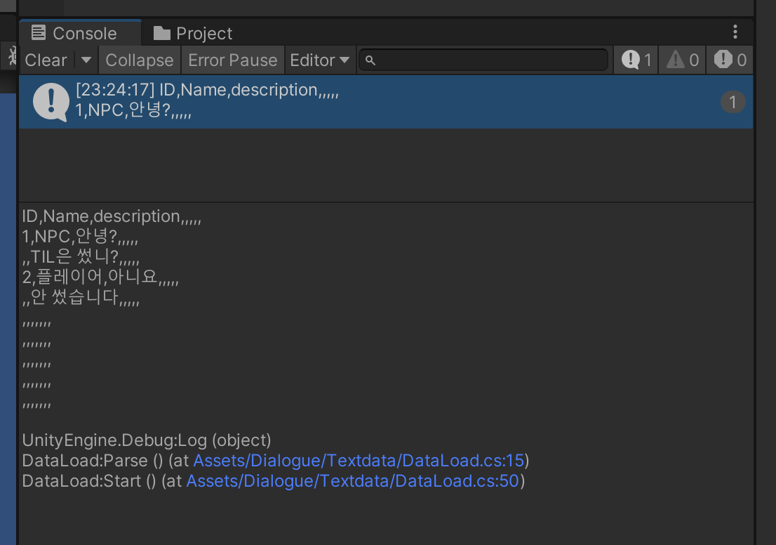 이제 쉼표로 텍스트를 구분해서 ID, Name, Context의 데이터를 독립적으로 출력해보자.