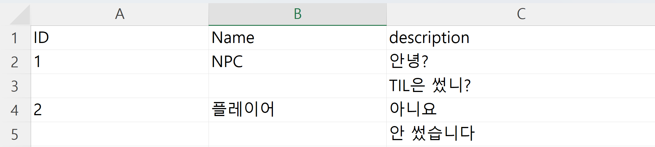 엑셀 파일이 .csv 형식으로 변환되었을 때 행은 enter(줄 띄워쓰기)로, 열은 쉼표(,)로 구분되어 저장된 것을 확인할 수 있다. 그래서 Split 메서드를 통해 띄워쓰기와 쉼표로 데이터를 구분해서 출력해볼 것이다.
