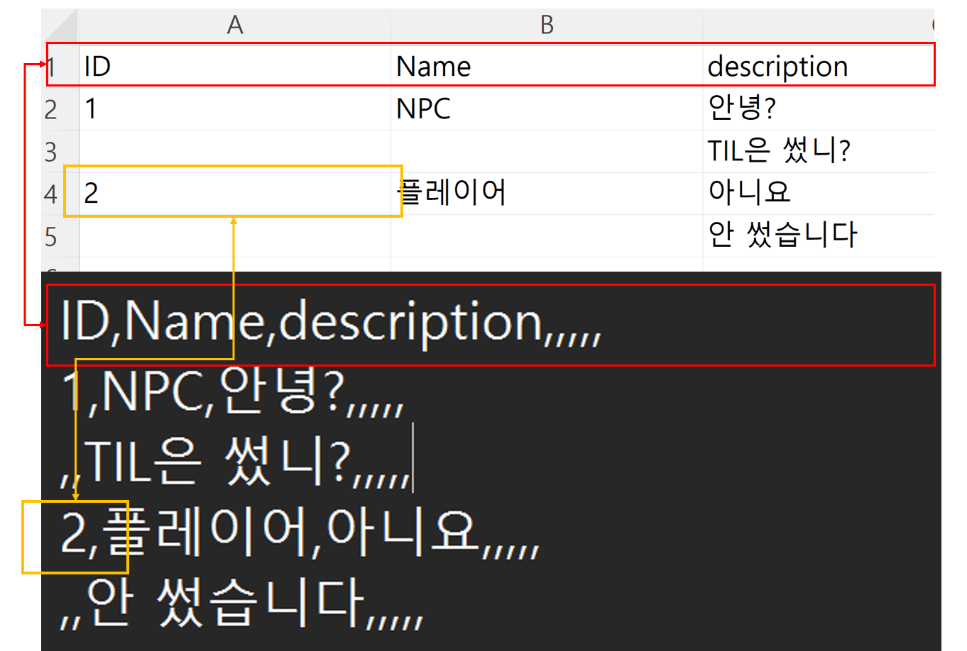 열과 행이 ,와 Enter로 구분되는 것을 알 수 있다.