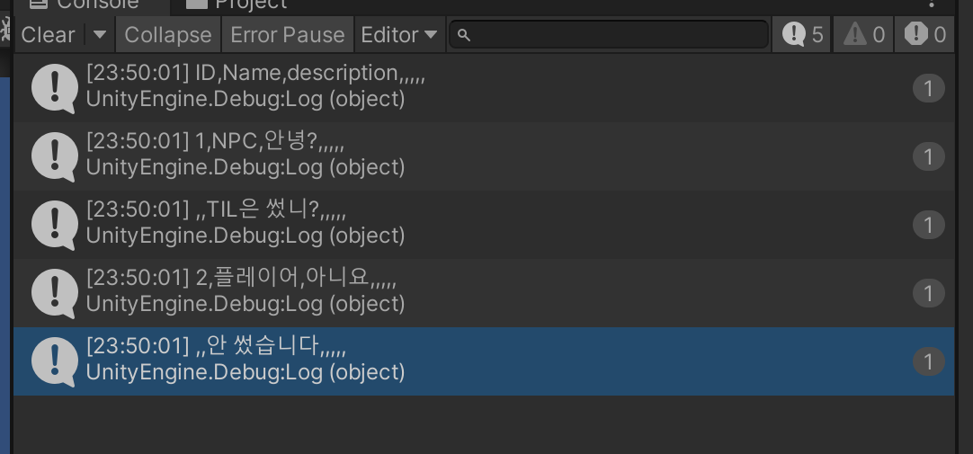 이제 쉼표로 텍스트를 구분해서 ID, Name, Context의 데이터를 독립적으로 출력해보자.