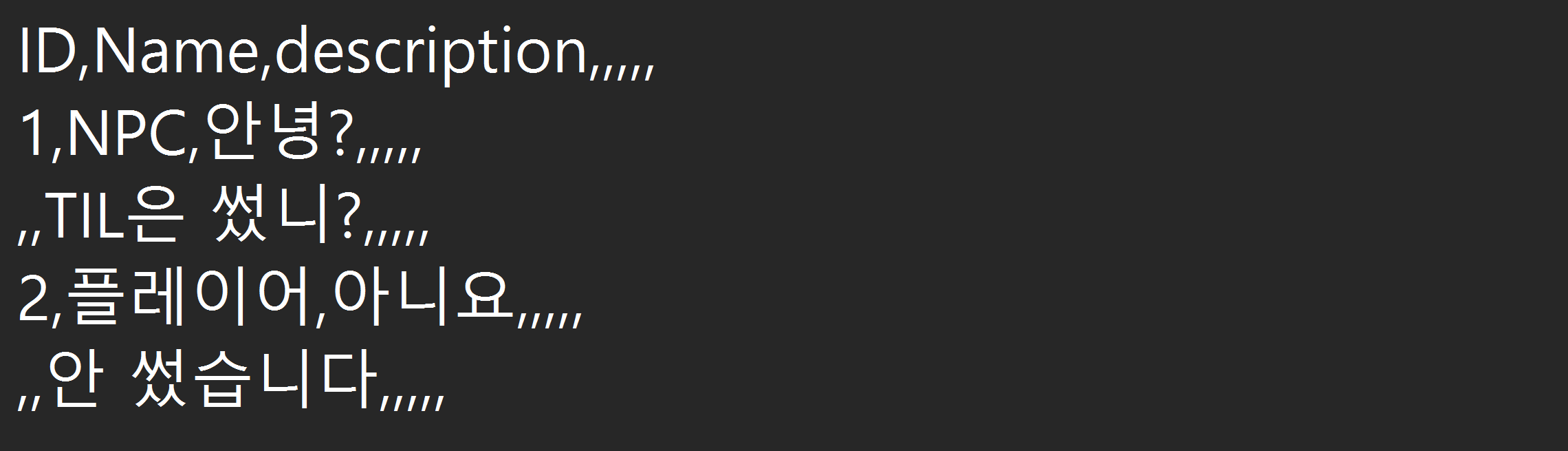 엑셀 파일이 .csv 형식으로 변환되었을 때 행은 enter(줄 띄워쓰기)로, 열은 쉼표(,)로 구분되어 저장된 것을 확인할 수 있다. 그래서 Split 메서드를 통해 띄워쓰기와 쉼표로 데이터를 구분해서 출력해볼 것이다.